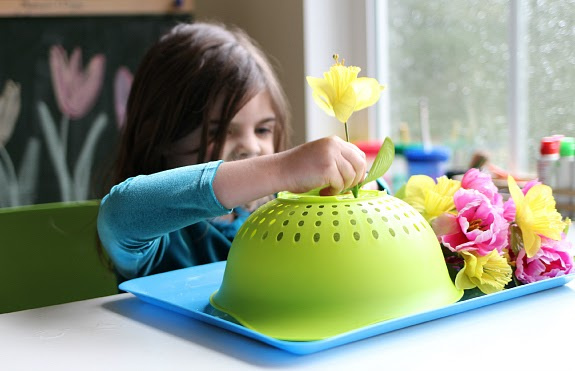 You can purchase all the items for this activity that you will need from the dollar store. All you need is a pot strainer or something with holes in it, and pretend flowers. The goal is for the children to place the flowers in the holes. And again this promotes their fine motor skills and helps develop them.