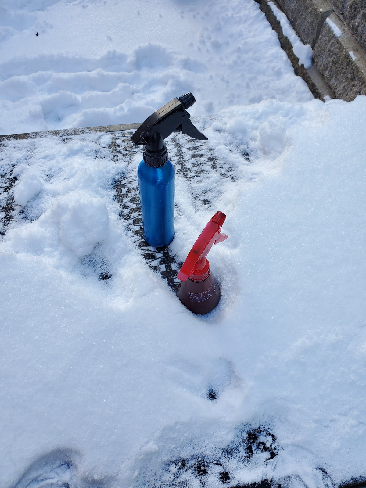 Snow paint for the outdoors is a creative and fun activity you can do with infants and toddlers. All you need is a spray bottle, water, and paint. You mix a spray bottle with some paint and water and voilà you have a fun and simple activity you can do outside.